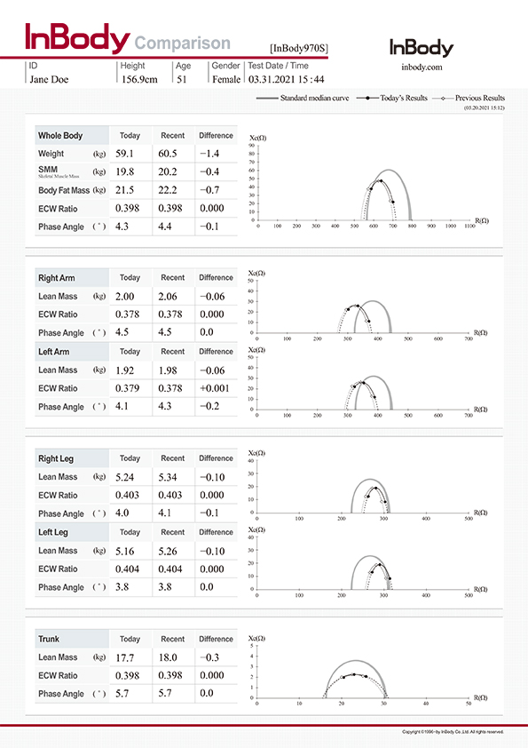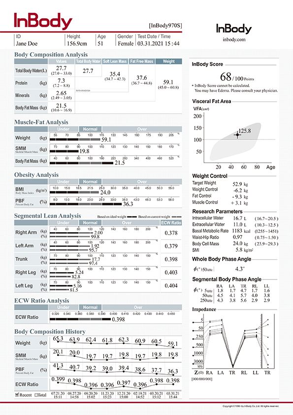 - Sastav tijela: Svaki InBody test ispisat će rezultate na cijeloj stranici s detaljnim vrijednostima mišića, masti i vode korisnika. inBody770S pruža najopsežniju analizu tijela iz InBody linije.
