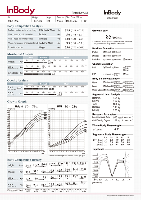 - Sastav tijela za djecu: InBody tablica rezultata za djecu, koja vam omogućuje da na prvi pogled vidite rast i fizički razvoj, pruža standardnu krivulju za rast djece kako bi djeca mogla lako provjeriti svoj status rasta.
