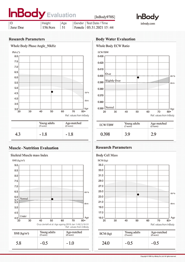 - List s rezultaima evaluacije: Na temelju 13 milijuna skupova InBody Big Data, pruža grafikone prosjeka i standardne devijacije za svaki parametar rezultata prema dobi. Omogućuje komparativnu procjenu između različitih ili istih dobnih skupina za objektivniju analizu sastava tijela.