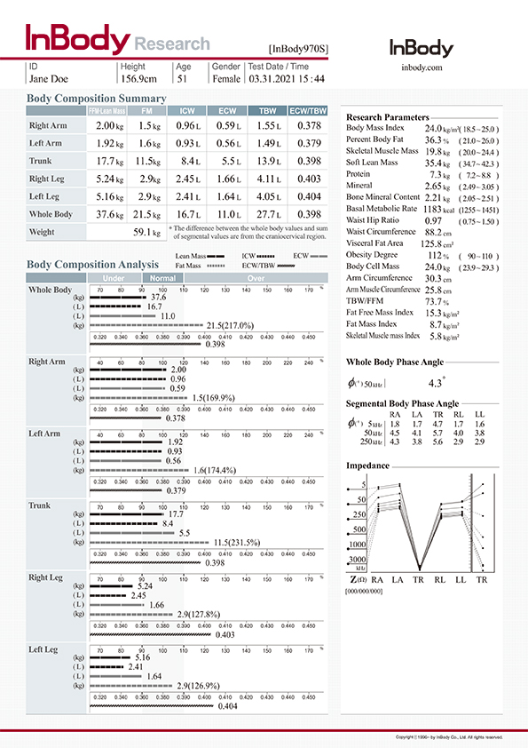 - Analiza vode u tijelu: prikazuje sastav tjelesne vode i segmentalnu analizu tjelesne vode kako bi se pratili trendovi i otkrile neuobičajene promjene u raspodjeli tekućine koje mogu biti posljedica ozljeda, starenja, pretilosti i drugih zdravstvenih čimbenika.