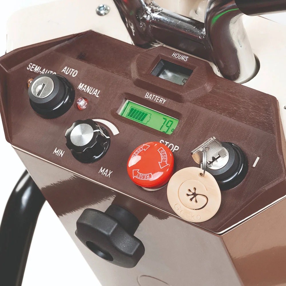 - Upravljačka ploča (Ključ za paljenje, Tipka za hitne slučajeve, Regulator brzine, Indikator baterije, Brojač vremena rada, Ključ za odabir: automatski, poluautomatski i ručni, Izbornik nagiba za spajanje invalidskih kolica)