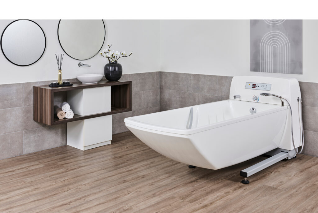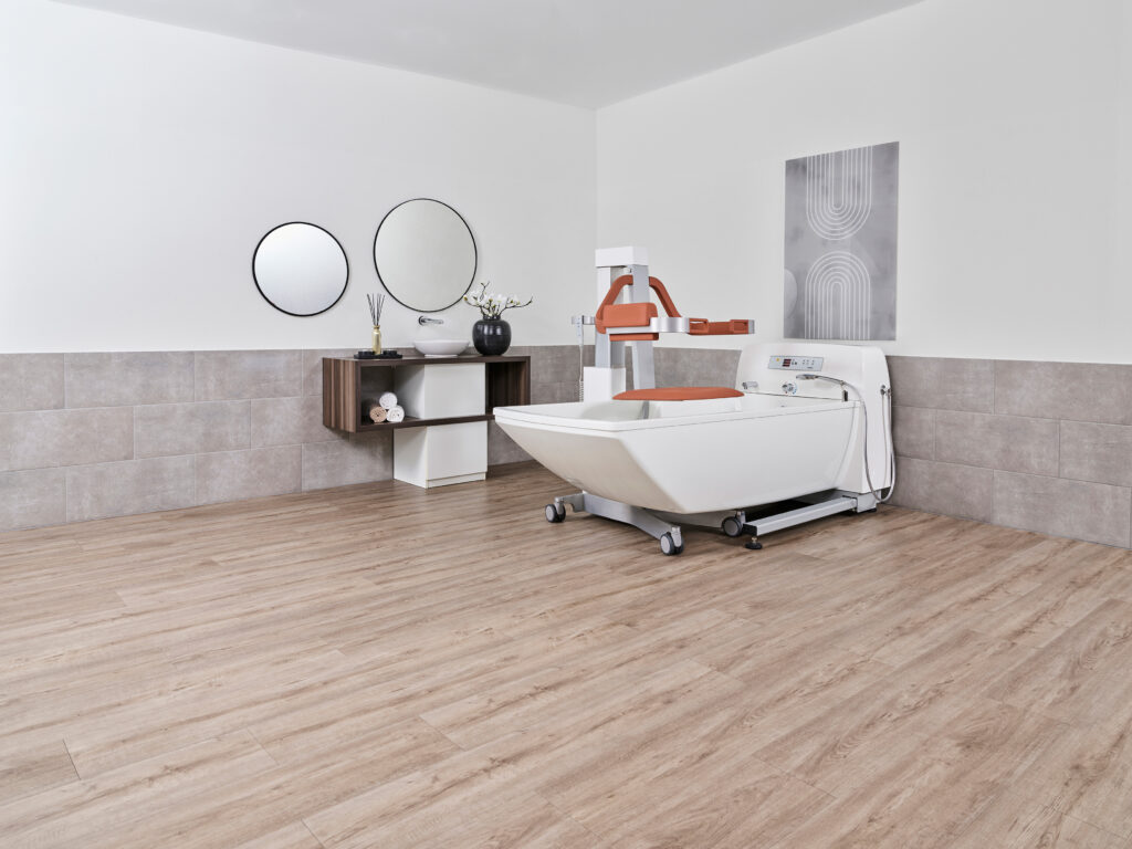 Kada ima pristup s tri strane što omogućuje jednostavno korištenje podizača za kadu, čak i u ograničenom prostoru. Bez pričvršćivanja na zid, kada sigurno stoji u prostoriji i može se optimalno prilagoditi vašoj kadi za njegu.